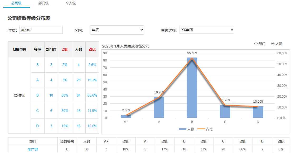 ● 在公司级点击穿透查询部门级绩效等级和分值构成